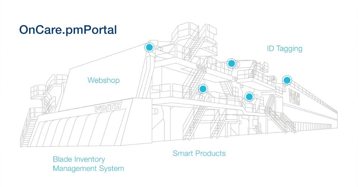 A gestão de dados e de estoques de produtos e consumíveis envolve uma grande quantidade de trabalho administrativo. A nova ferramenta digital de gestão de ativos OnCare.pmPortal oferece aos produtores de papel uma maneira ideal de aumentar a transparência de dados de produtos, melhorar a eficiência do sistema de compras, facilitar o planejamento de paradas e períodos de manutenção, bem como aumentar a disponibilidade de suas fábricas. Graças a uma conexão direta com o Webshop da Voith Paper, os componentes cadastrados podem ser pedidos de forma rápida, fácil e sem risco de equívocos.